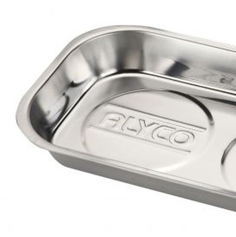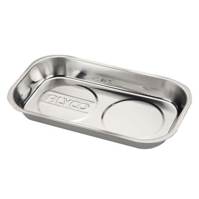 Soporte de Acero Inoxidable magnético con posibilidad de mantener en sobremesa, o también en superficies de soportes metálicos (Carros, mesas de trabajo, etc.) para mantener pegados objetos metálicos (tornillos, pernos, tuercas, etc). Consta de una superficie en Acero Inoxidable con profundidad de 28 mm., dos potentes imanes adheridos al fondo con potencia de 1000 Gauss, y base de PVC para proteger las superficies y evitar rayados. Soporte ligero y fabricado en Acero Inoxidable, lo que le da larga vida útil. 2 potentes imanes con 1000 gauss de capacidad lo que permite fijar incluso piezas metálicas grandes sin peligro de desprenderse. Estos imanes permiten la fjación del plato a multiples superficies metálicas, como carros, mesas de trabajo, etc. tanto en posición horizontal (sobremesa), como vertical (pared vertical de un carro). El fondo es de PVC lo que protege la superficie de pegado de rayas Muy apto en industria, mecánica de automóvil, etc.
