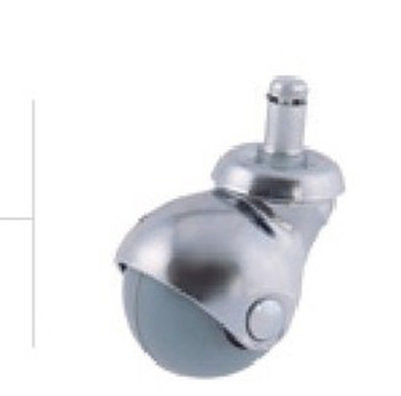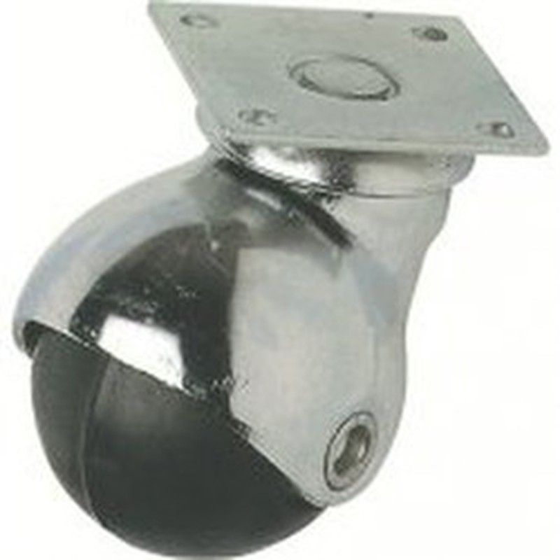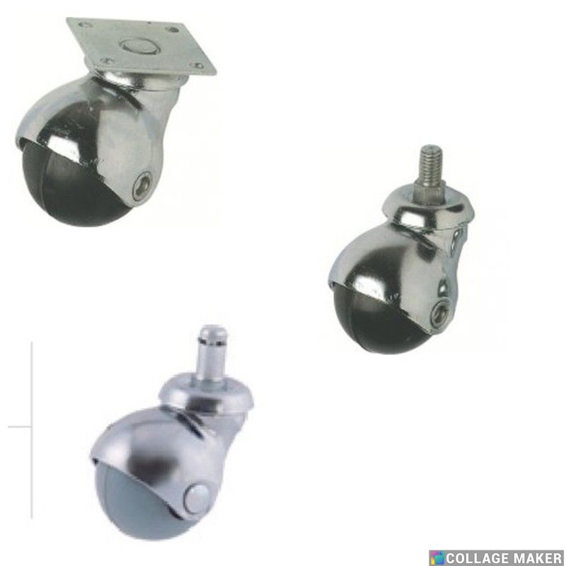 Soporte: Giratorio de acero estampado de 1,5 a 2 m/m. de espesor, con espiga lisa cilíndrica para tacos de plastico, espiga roscada, anilla ó platina base de sujeción horizontal. Rodamiento: Dos hileras axiales de bolas de acero. Acabado: Cromado brillante ó dorado (sobre demanda). Aro Gema Goma Aro: Bandaje de Goma negra ó goma gris en forma balón inyectado sobre núcleo de nylon (poliamida) en color negro. Rodamiento: Buje con taladro liso. Acabado: Conjunto ensamblado a través de remache.